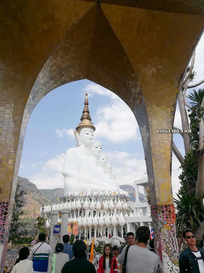 เมื่อไหว้เสร็จแล้วก็ขับรถต่อไปที่ วัดพระธาตุผาซ่อนแก้ว กันเลย ต้องพูดว่าที่นั่นสวยงามมาก เป็นอันซีนของจังหวัดเพชรบูรณ์เลยก็ว่าได้ ด้วยความงดงามทำให้ที่นี้ก็เป็นจุดที่นักท่องเที่ยวแวะมาจำนานมาก และเป็นที่ประดิษฐานของ “พระพุทธเจ้า 5 พระองค์” พระพุทธรูปสีขาวซ้อนกัน 5 องค์ มีความใหญ่โตโอ่อ่าที่งดงามมาก แถวบรรยากาศโดยรอบก็ล้อมด้วยทัศนียภาพรอบด้านที่เต็มไปด้วยขุนเขาและเมฆหมอก