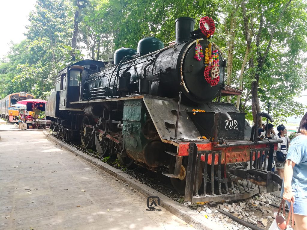 รถไฟมาจอดที่บริเวณน้ำตก ติดกับหัวรถจักรไอน้ำสมัยสงครามโลก